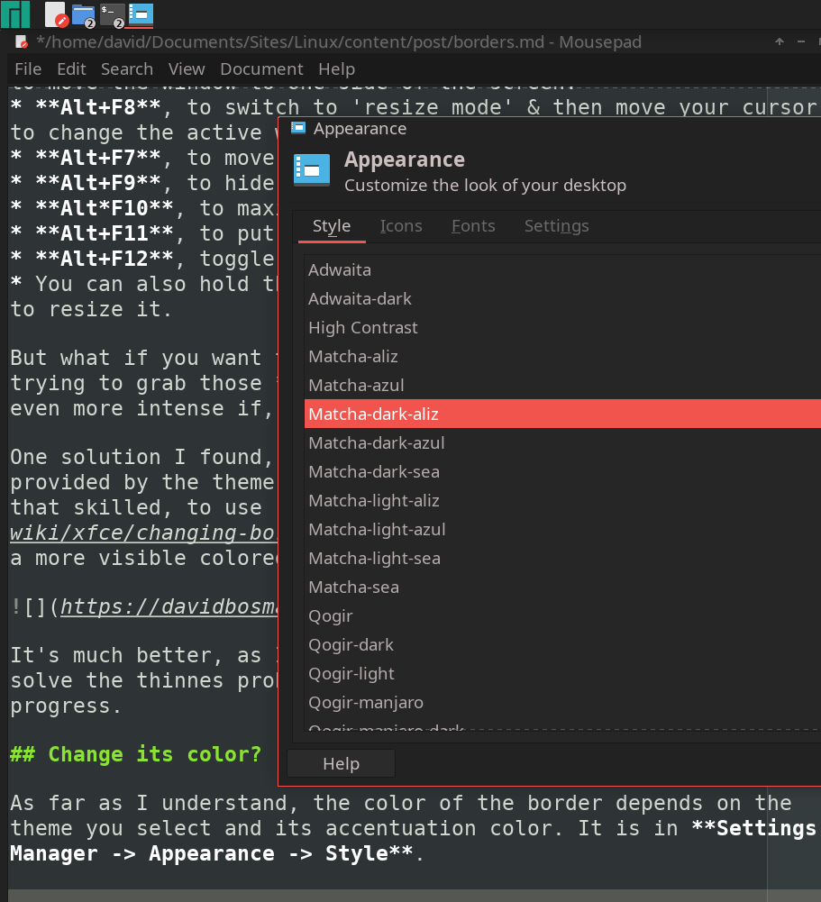 By default, I find Xfce’s windows borders very hard to resize: they’re barely visible and they are too thin. Alas, Xfce lacks an option to easily change that. The idea probably being that you should instead use the many keyboard shortcuts to move and/or resize your window. They work well, and you can customize them if you want. On my installation, they are: