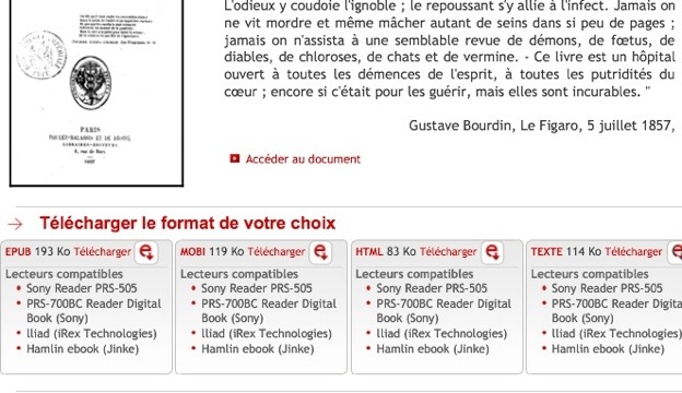 Je viens de voir que Gallica nous propose des ebooks. Trois livres, pour le moment, proposés dans quatre formats : ePub, mobi, HTML et TXT. C’est une très bonne idée, tout comme de lister pour chaque format différentes liseuses compatibles. On regrettera juste l’absence de mention de deux des liseuses les plus utilisées : iPad et Kindle.